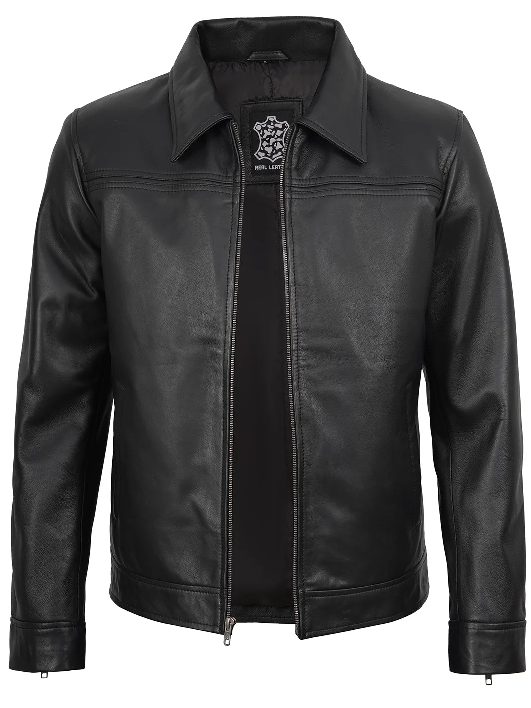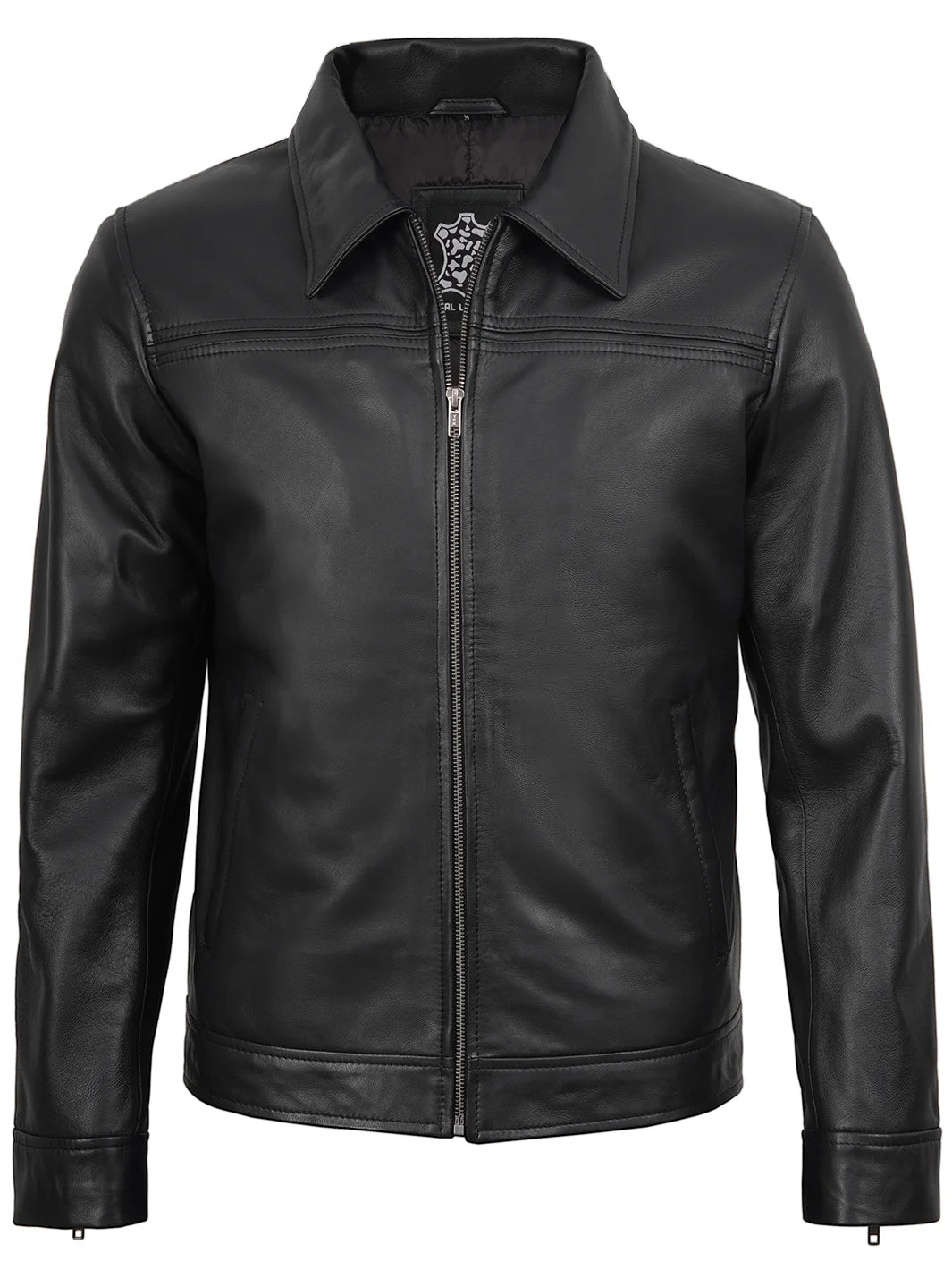 Giacca classica da uomo in pelle di agnello nera con colletto a camicia e chiusura con zip affidabile. Presenta pratiche tasche esterne e una vestibilità sartoriale adatta sia al casual sia alle occasioni serali.